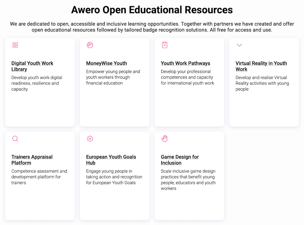 Familiarise yourself with Awero resources, including examples of badge use, digital platforms, and training opportunities.