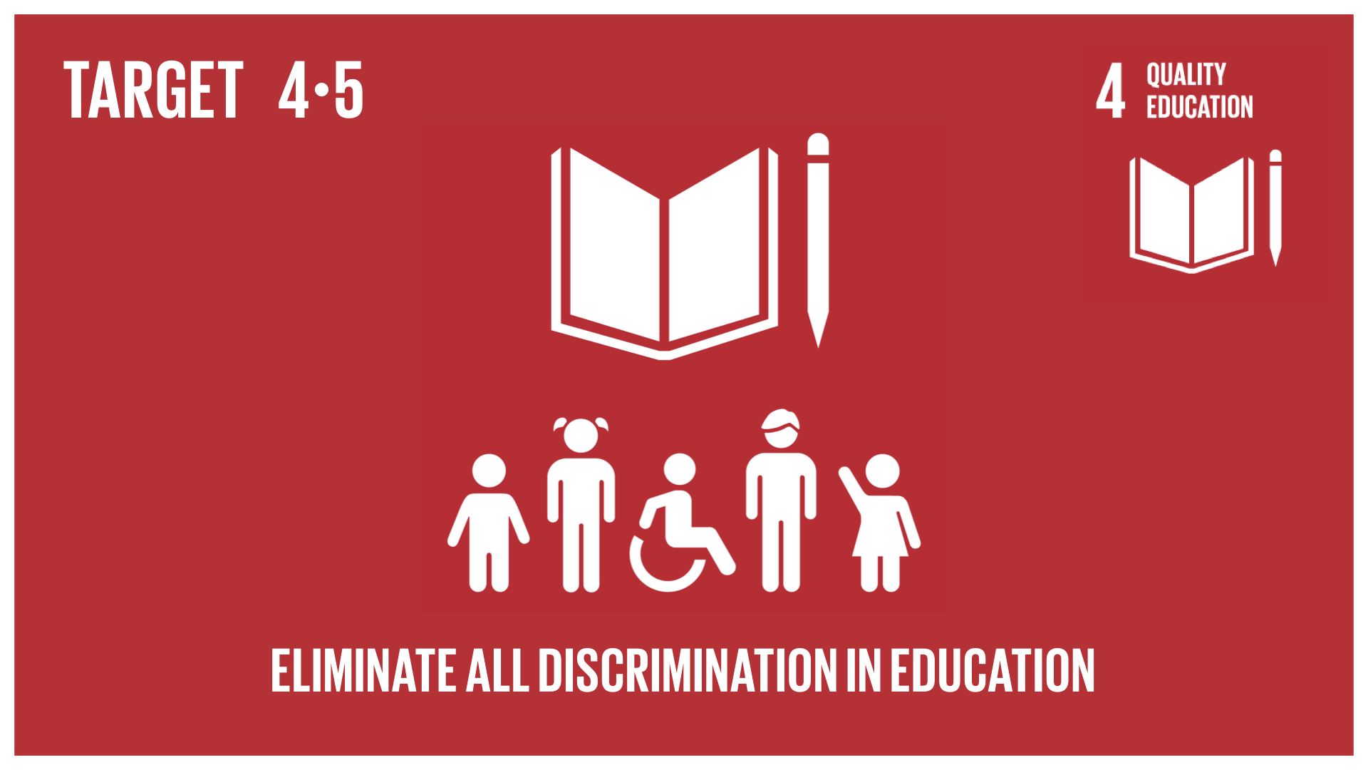 4.5 Tegen 2030 genderongelijkheden wegwerken in het onderwijs en zorgen voor gelijke toegang tot alle niveaus inzake onderwijs en beroepsopleiding voor de kwetsbaren, met inbegrip van mensen met een handicap, inheemse bevolkingen en kinderen in kwetsbare situaties.