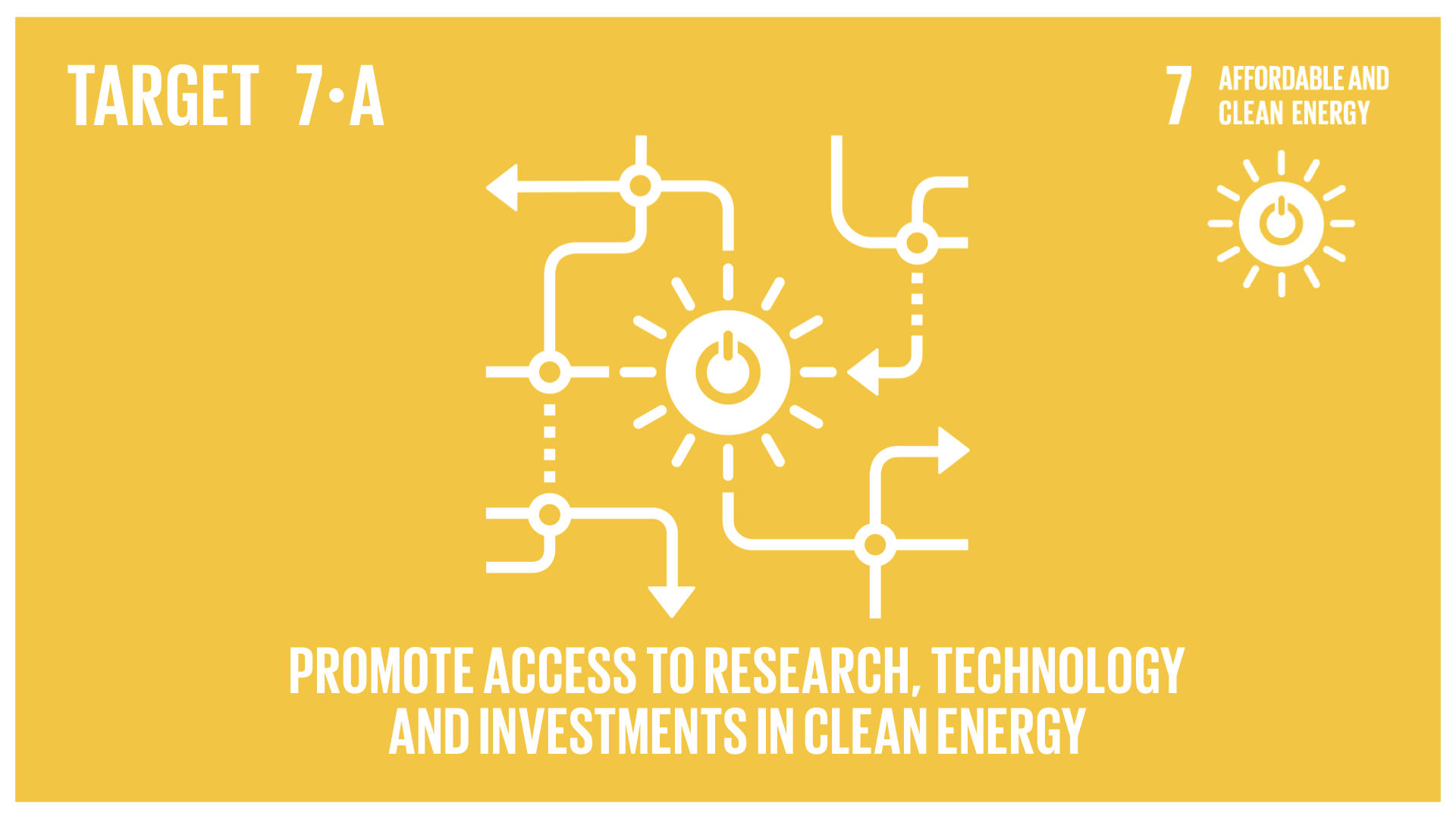 7.a Tegen 2030 de internationale samenwerking verhogen om toegang te vergemakkelijken tot onderzoek en technologie inzake schone energie, met inbegrip van de hernieuwbare energie, de energiedoeltreffendheid en de geavanceerde en schonere fossiele brandstoffentechnologie, en de investering promoten in energie-infrastructuur en schone energietechnologie.